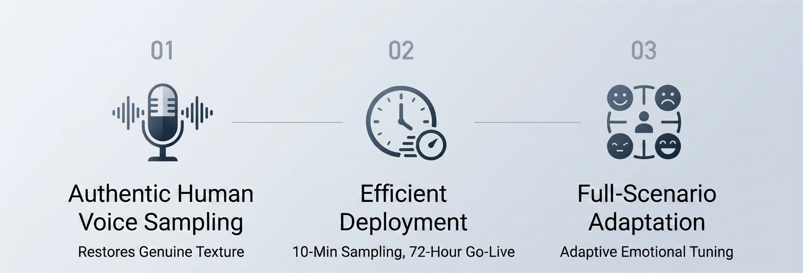 - Exclusive Brand Clone: A "one-click" customized voiceprint for your brand spokesperson or lead agent. This creates a unique "Voice IP," unifying your global service image and strengthening brand recall.