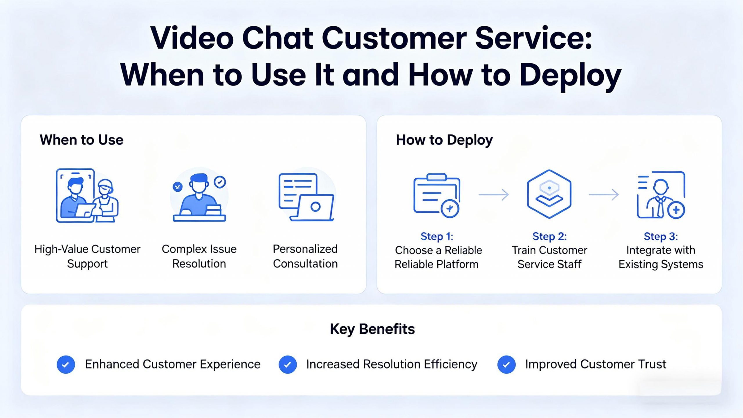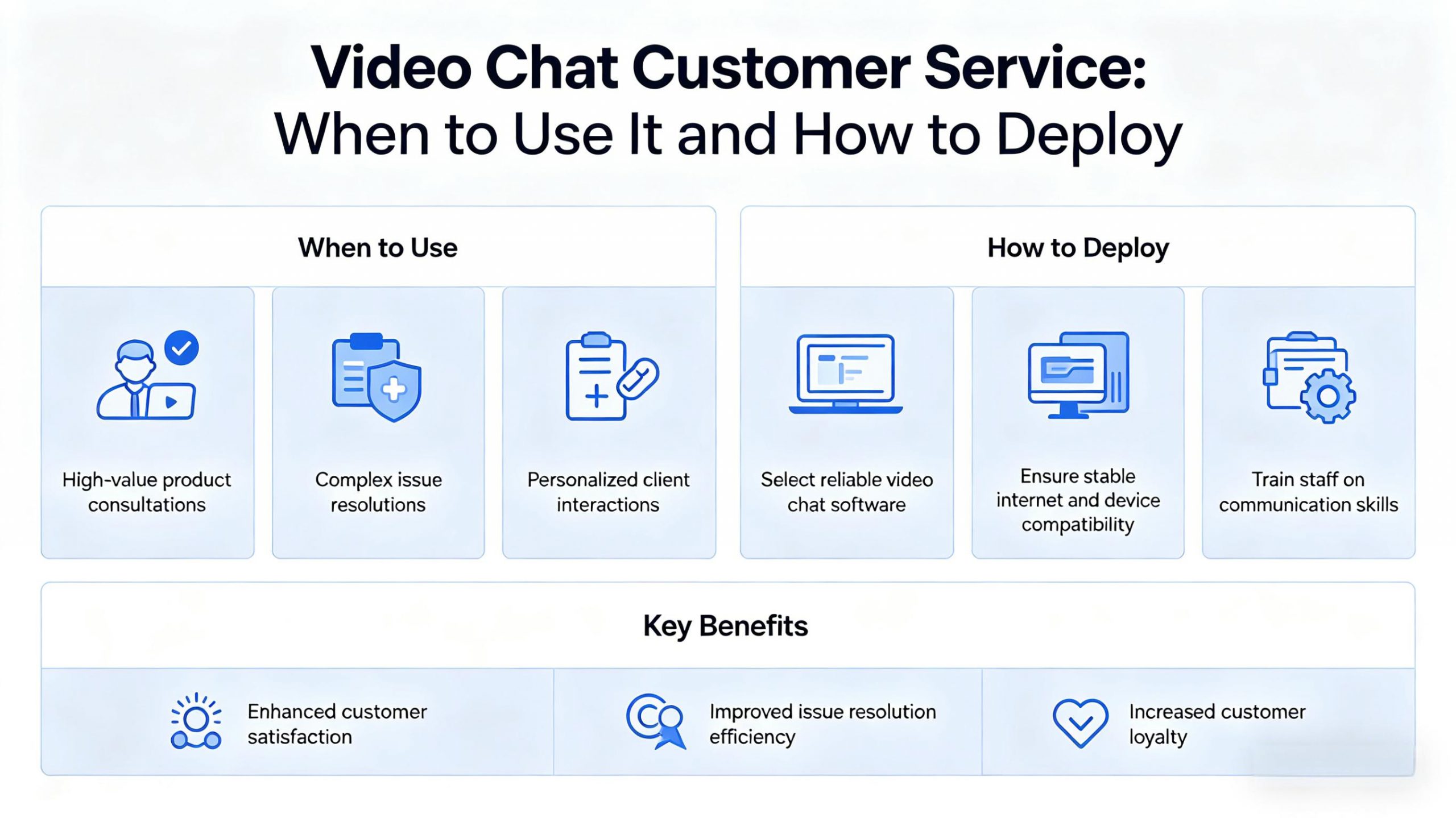 1. Use video as an escalation channel, not a first touchpoint. AI chatbots and self-service portals handle routine inquiries efficiently. Reserve live video for moments when visual context, emotional nuance, or verification is essential. This hybrid approach maximizes agent efficiency while preserving the human touch when it matters most.